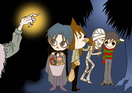 ずんずん暗い森を進んで行くとぽつりと一件の家。 吸血鬼の男がドアを叩くと、 メガネをかけた老婆が出てきました。 「ここに人が来るなんて珍しいのね。 クッキーをたくさん焼いた甲斐があったわ。 これを持ってお行き」 ブリキでできたバケツ一杯に きらきらした飴玉や、シナモンのクッキー。 「ここから先は灯りがないから右へ行きなさい」 「ありがとう!良いハロウィンを!」 手を振る老婆を後にして4人はずんずん歩きました。