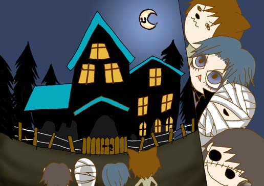 もう何件回ったでしょうか。 4人は両手いっぱいにお菓子を持って上機嫌でした。 すると、ある家の前で立ち止まりました。 「この家、見たことあるよね?」 「あるある、この悪趣味な屋根の色!」 「耳障りな番犬の鳴き声!」 「僕達を埋めた奴の家だ。」 「 仕 返 し だ ! ! 」