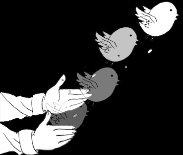 ♪・♪♪・♪―〜〜♪・♪・・・ 独特の旋律が部屋中に響き渡ります。 「ちょっと、静かにしてくれない?ペンが進まないよ」 小説家は、鳥を見もしないで言いました。 小説が認められないのに加え、 スランプ中で頭が爆発してしまいそうでした。 それでも鳥は歌い続けます。 普段なら、歌を歌えば小説家はとても褒めてくれたのですから。 この歌は、小説家が自ら作って教えた歌でした。 しばらくペンを止めて下を向いていた小説家でしたが、 やがて乱暴に席を立つと、 鳥籠を抱えて 「そんなに歌いたいのなら、歌ってくればいい!」 と言って 鳥を窓から放してしまいました。 ←●→
