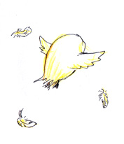只今、彼は大作の執筆中です。 どんな話かって? 奇妙な男と食事をする話!! その後この本が認められて、彼が一流の小説家になるのは また別の話!! おしまい。 ←●→
